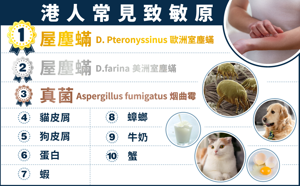 到底引起港人敏感的頭號「大敵」是誰?香港港安醫院—荃灣及香港港安醫院—司徒拔道用了五年時間做統計,對超過2300個疑有過敏感症患者的樣本進行ImmunoCAP specific IgE血液檢測的數據分析,為香港人找出答案。結果竟意外發現霸佔頭五個致敏原排名都屬居家環境因素,首兩個最大「元兇」皆是塵蟎,其後為真菌及貓狗寵物皮屑,蛋、奶、蝦等食物要「借借先」。