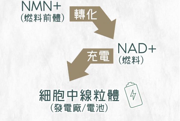 NMN為 β-nicotinamide mononucleotide的英文縮寫,是一種於人體及食物中存在的天然物質,它能夠在細胞中轉化成NAD+,激活長壽因子SIRT,為細胞嘅線粒體提供能量,促進身體各種機能運作。「隨著年齡增長,人體的NAD+ 水平不斷下降,令線粒體功能退化,導致身體各種機能衰退,包括:記憶力變差、肌膚鬆弛、膚色暗啞、出現白髮、精神欠佳、免疫力低、睡眠質素下降等。」那麼,可以直接補充NAD+嗎?Annie續說:「NAD+分子比較大,進食後難以透過細胞膜進入細胞,而NMN 分子較細,進食後可迅速進入血液及身體組織,提升 NAD+ 水平,發揮抗衰老作用。