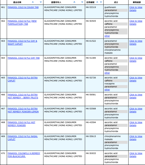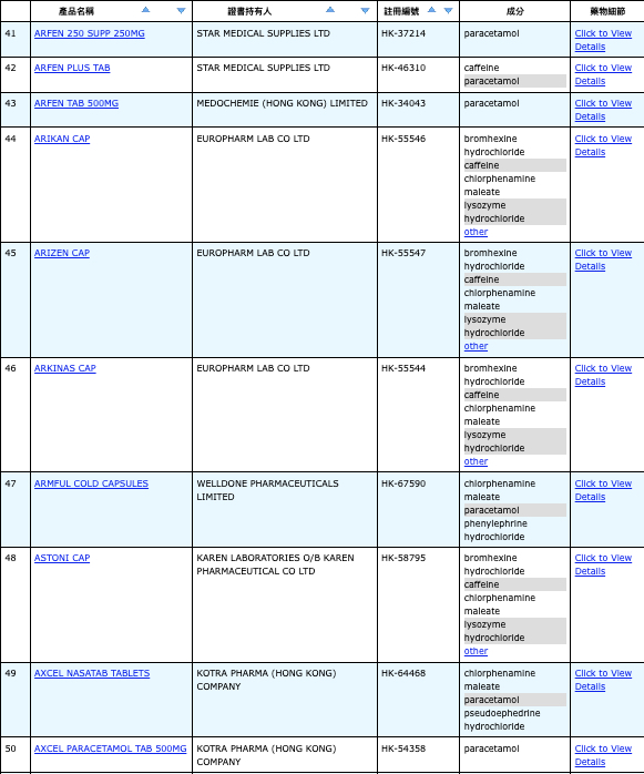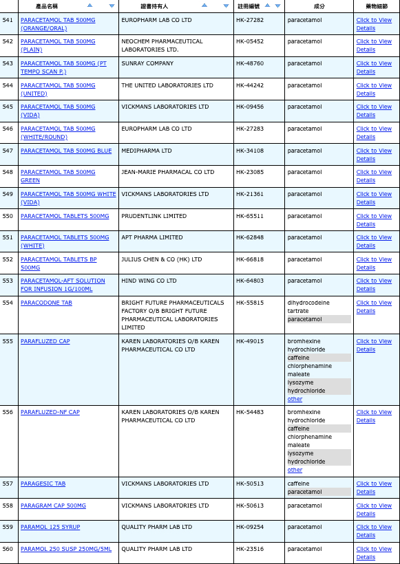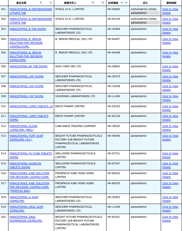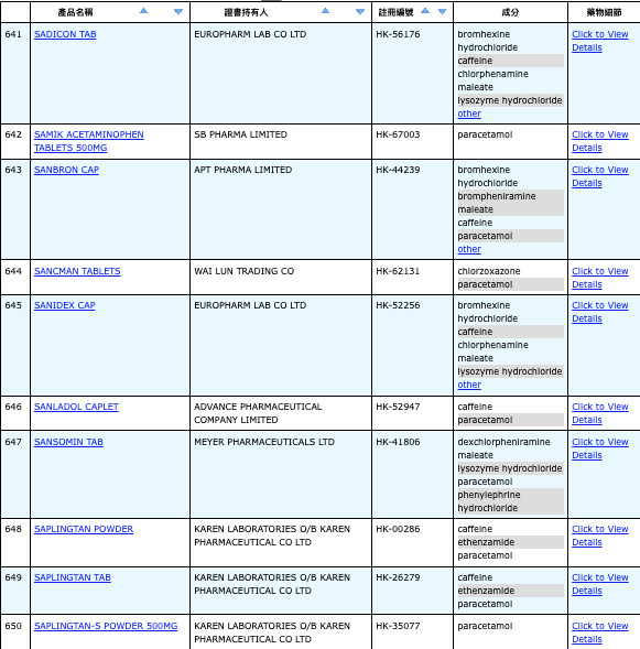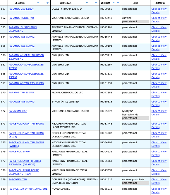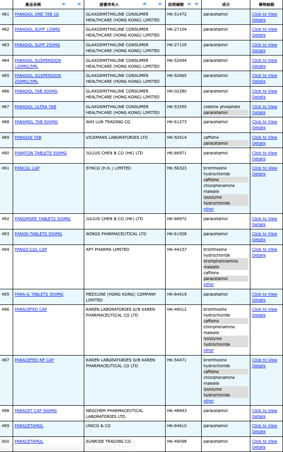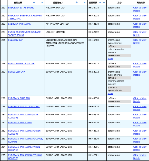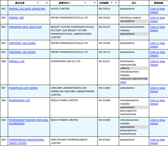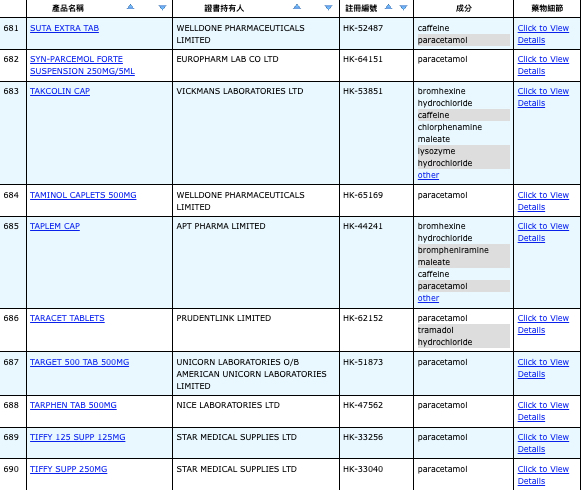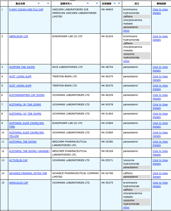 亦即是大家可先到網站,在搜尋位置輸入撲熱息痛的英文「Paracetamol」,再按搜尋的放大鏡,網頁就會顯示756個結果,包括產品名稱、註冊編號、藥物成分、其他詳細資料。