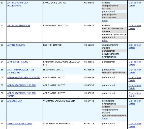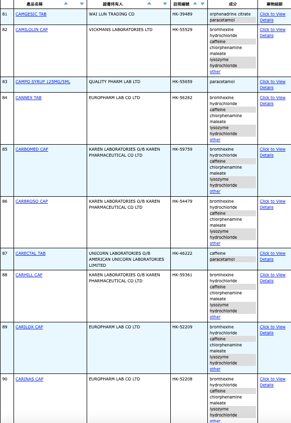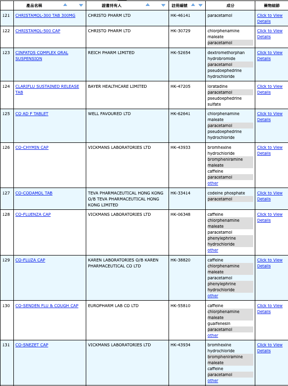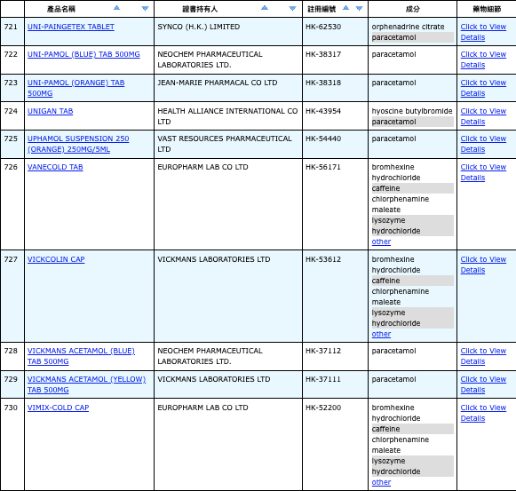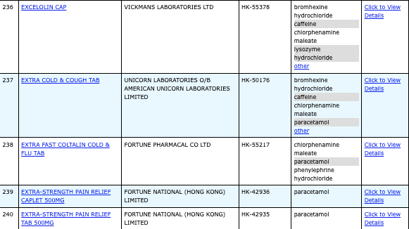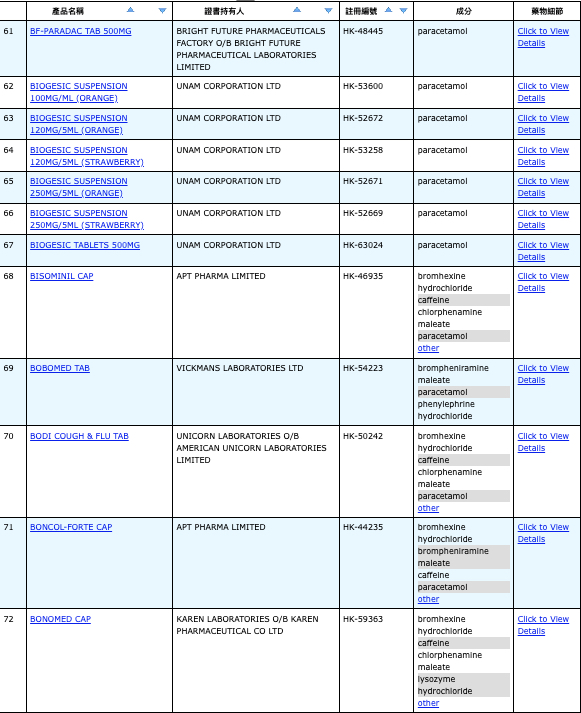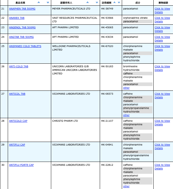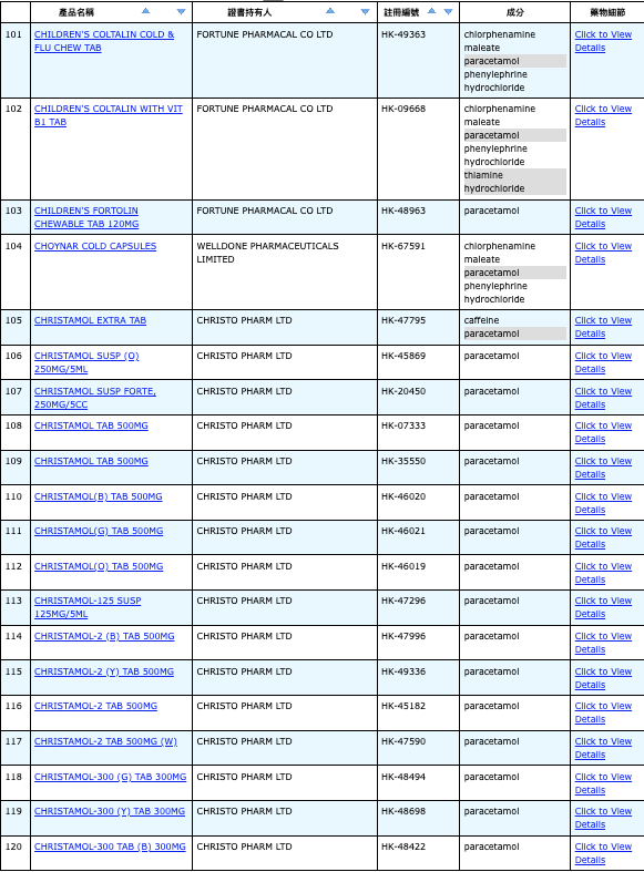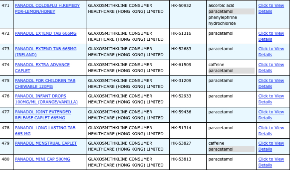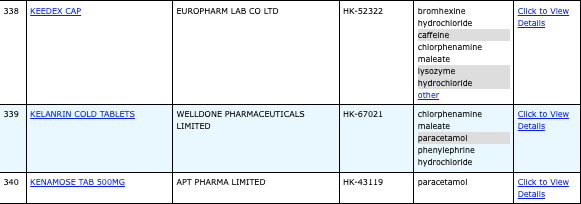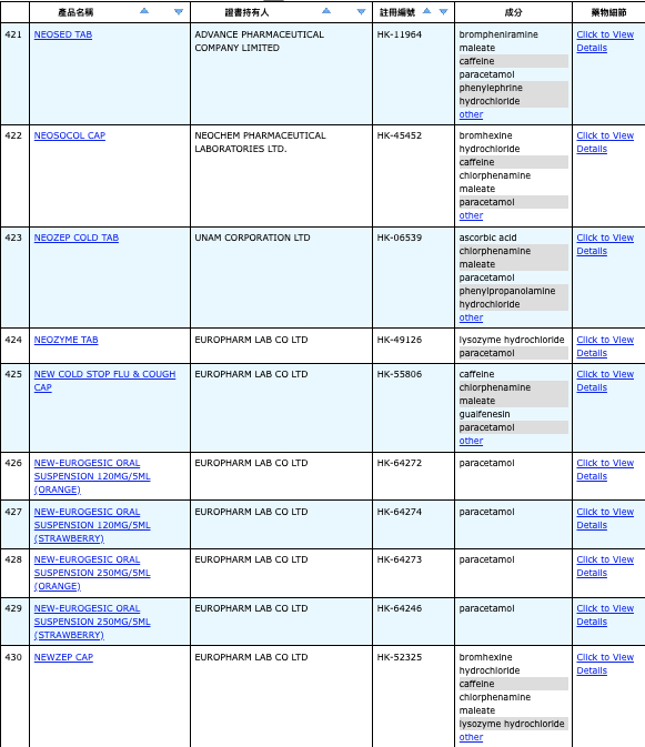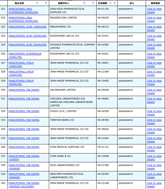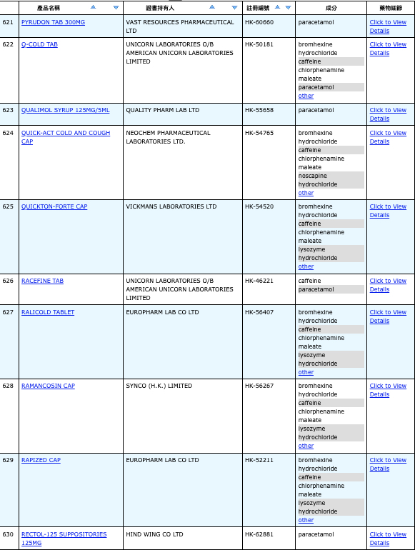 亦即是大家可先到網站,在搜尋位置輸入撲熱息痛的英文「Paracetamol」,再按搜尋的放大鏡,網頁就會顯示756個結果,包括產品名稱、註冊編號、藥物成分、其他詳細資料。