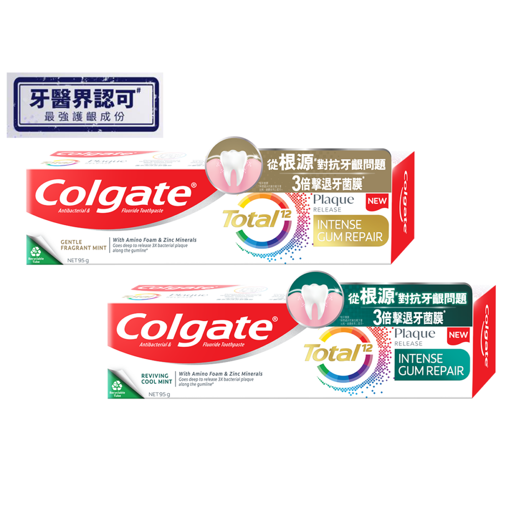 高露潔TOTAL全新產品「高露潔Total全效專業深層牙齦修護牙膏」含有牙醫界認可最強護齦成份 Zinc^,從根源*對抗牙齦腫痛及萎縮,而且更有獨特AminoF技術,微米級泡泡深層渗透牙齦,將抗菌Zinc物質帶到牙齦最底層。重點是可針對性深層去除牙齦線下3mm的牙菌膜,3倍擊退牙菌膜,有助強化牙齦。