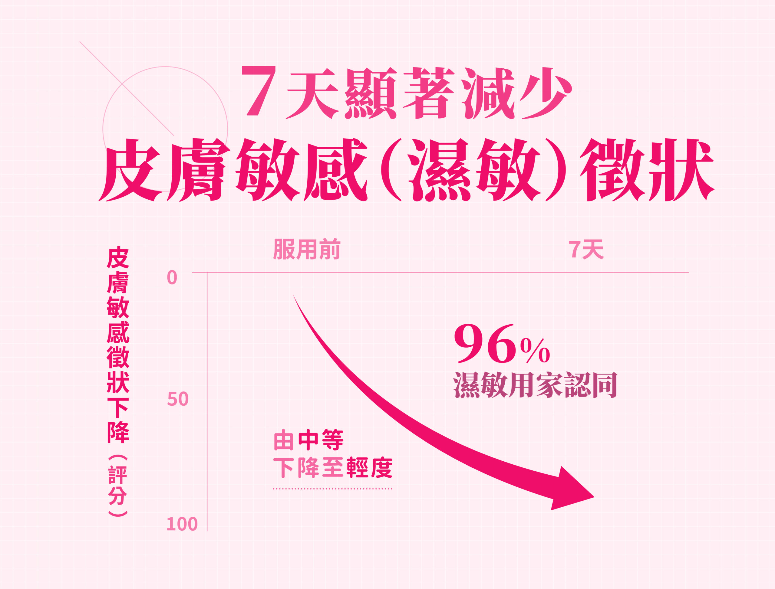 連續服食7日,96%濕敏用家一致認同徵狀減少,如痕癢、紅腫及脫皮等情況,痊癒速度亦與睡眠質素都有提升;對增強上呼道防禦能力、調理腸道不適、改善便秘或不順暢、減退皮膚敏感徵狀都有明顯幫助,改善整體健康生活質素!