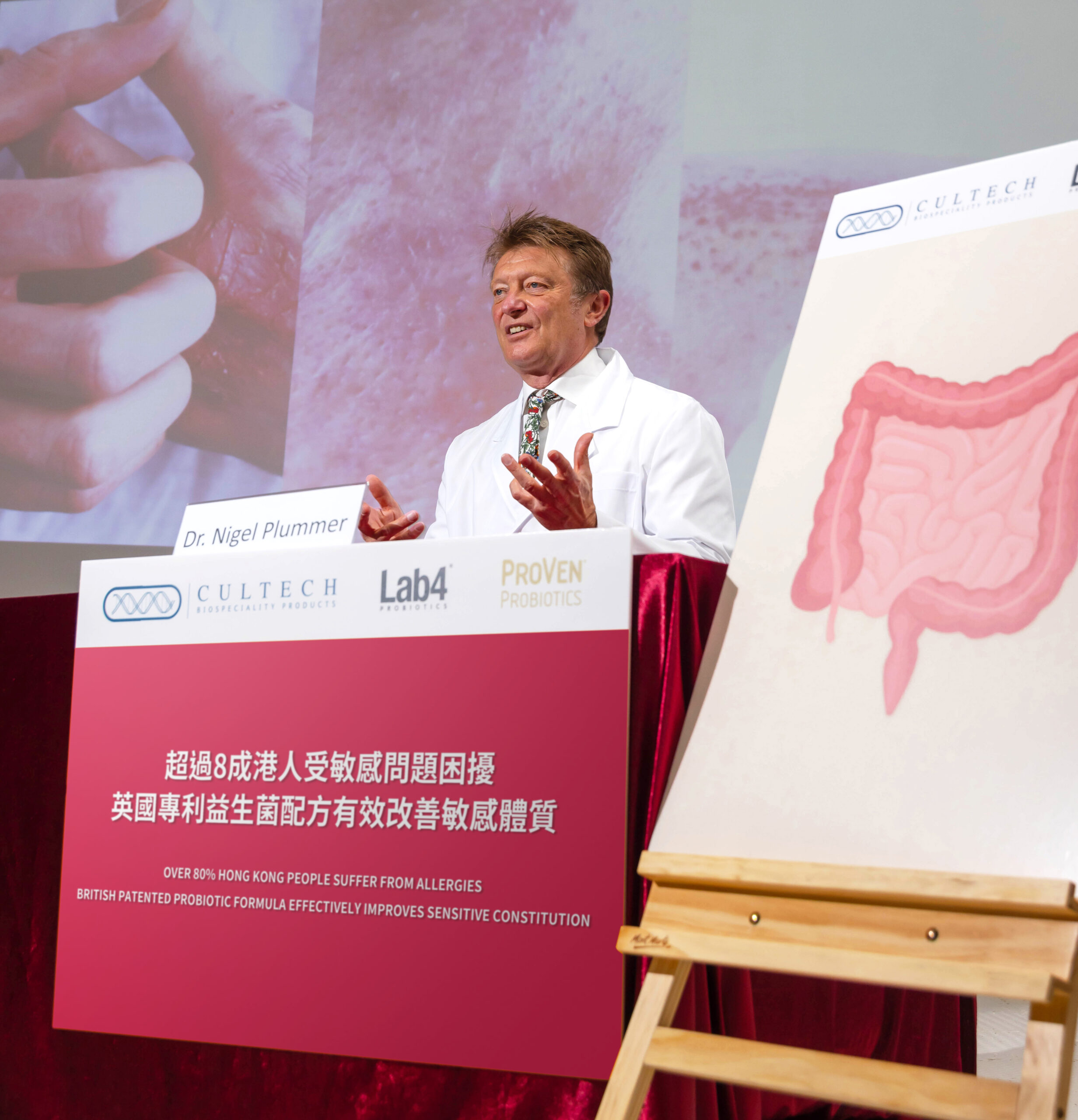 英國免疫微生物學家Dr. Nigel Plummer在發佈會中指出,濕敏與腸道益生菌有重大關連,當益菌及壞菌平衡出現問題,容易觸發濕敏問題發生。