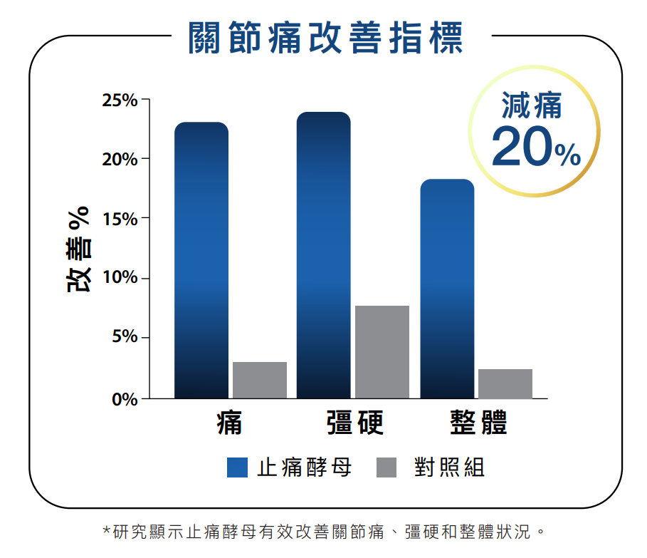 特別加入天然止痛酵母SAMe,與常用關節炎消炎止痛藥相比,改善關節炎疼痛及關節活動度效果差不多,但沒有非類固醇消炎止痛藥的相關副作用。不傷胃 、肝,快速有效。葡萄糖胺是一種胺基酸,存在於人體之中,小分子容易被人體吸收。科研實証每日服食1500mg葡萄糖胺,有效防止骨骼摩擦,保有關節活動的彈性,維持關節完整及骨骼結構功能。