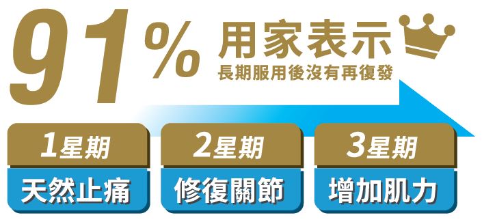 Return關節筋肌配方獲得大量用家好評推薦,98% 表示服用一星期有效舒緩關節痛楚;96% 表示服用兩星期能改善關節靈活;92% 表示服用三星期有助提升肌肉力量,更有91% 用家表示關節痛再沒有復發!