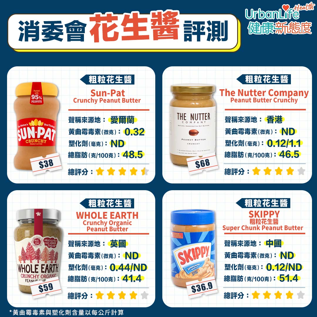 消委會搜集市面上10款粗粒和10款幼滑花生醬共20款進行測試。測試結果顯示,12款樣本檢出黃曲霉毒素,檢出的總和介乎每公斤0.23微克至4.94微克,全部均沒有超出香港標準。不過,以每公斤計算,其中2款樣本,分別為优味 YOWE 幼滑花生醬Peanut Butter Creamy,以及新竹福源 Fuyuan 花生醬 Peanut Butter,其黃曲霉毒素B1的檢出量,分別為4.27微克和 2.01微克,超出歐盟訂定的上限(2.0 微克)。另外,新竹福源的花生醬黃曲霉毒素總含量(4.94微克)亦超出歐盟上限(4.0 微克)。