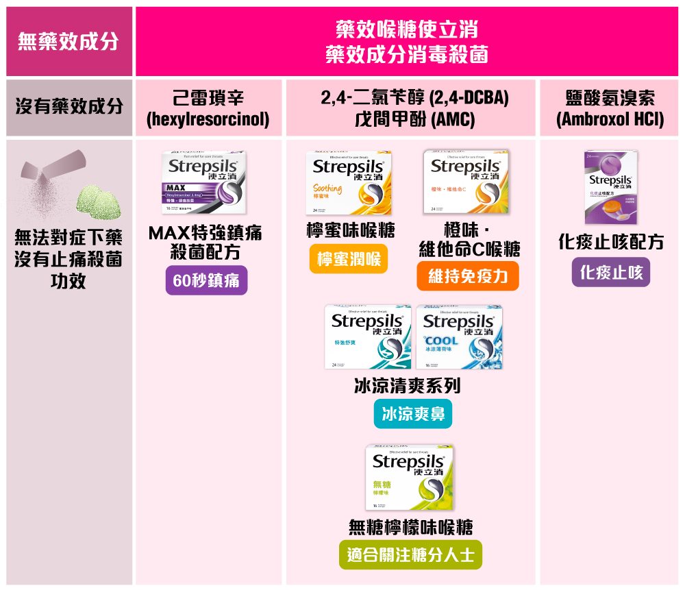 推薦!藥效喉糖品牌:使立消。使立消為全港銷量No.1品牌*,最多受訪用家認同使立消喉糖能有效消除喉嚨痛^。使立消全系列喉糖皆含有藥效成分,真正針對喉嚨不適或喉痛徵狀!