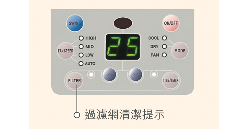 如何確保冷空氣夠乾淨?冷氣機內置健康過濾網,全面淨化空氣,令輸出的冷空氣倍感清新。另外特設過濾網清潔提醒燈,當冷氣機操作超過250小時,提示燈便會亮起,提醒用家需要清洗濾網,十分貼心。