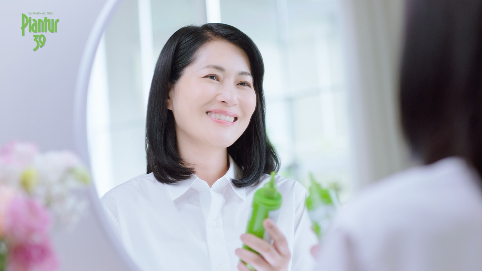 「我以前很喜歡綁馬尾,感覺比較年輕,不過有一天發現頭髮比以前掉得更多,以為是綁馬尾拉扯到頭髮造成,後來才知道是因為年齡增長導致的掉髮。自從使用了Plantur 39植物與咖啡因養髮精華液之後,明顯看到去水位﹑卡在梳子上的頭髮也少了,而且用法非常方便,每天在乾髮頭皮上滴上數滴便可,不用沖洗就可以出門了,頭髮更豐盈給我帶來更多自信!」(謝君宜 50歲 / 音樂老師)