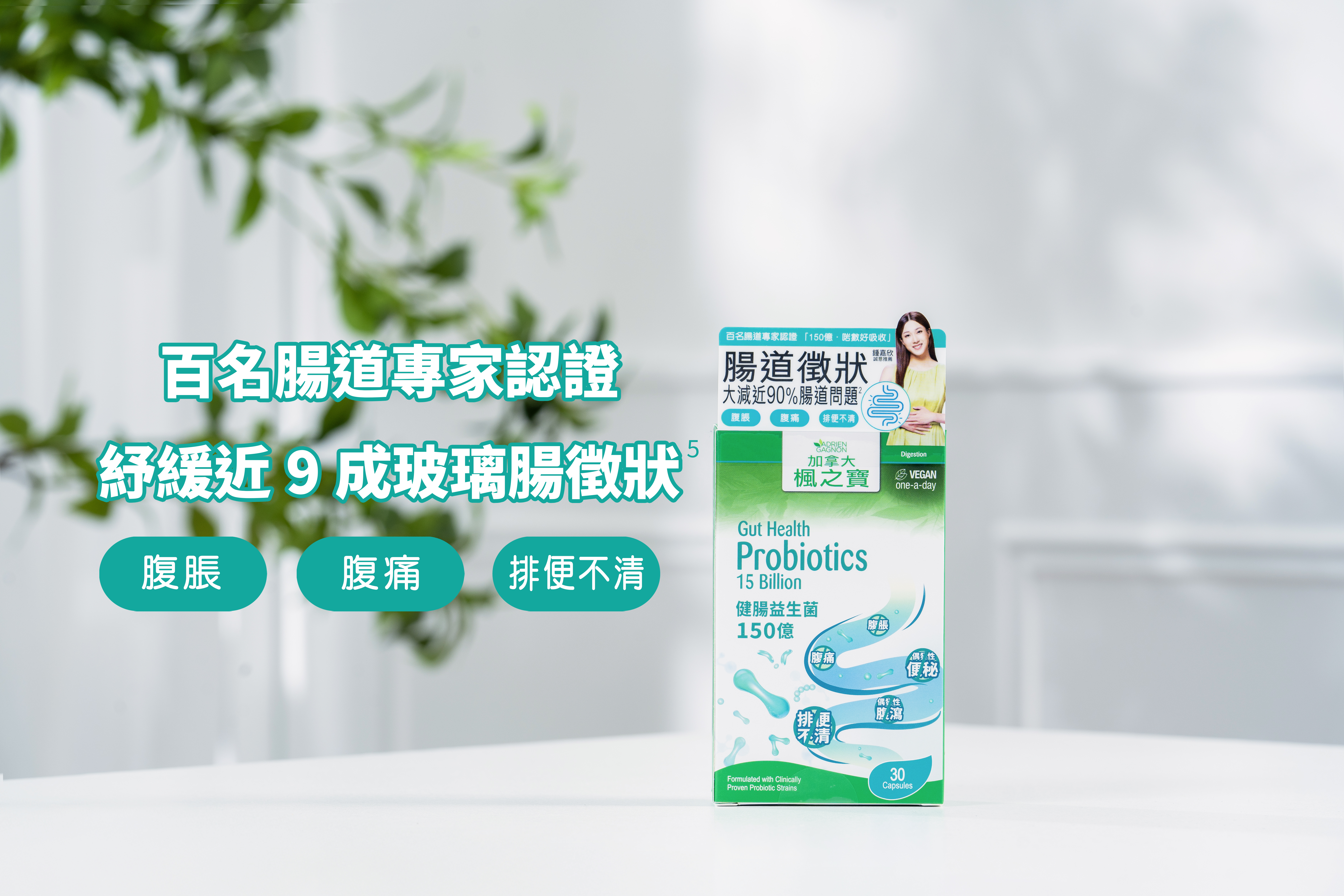 加拿大楓之寶全新益生菌系列,當中的健腸益生菌150億有百名腸道專家認証*,證實150億足夠腸道每日所需¹!特別採用專利菌株植物乳桿菌及瑞士乳桿菌,可平衡腸道微生態,紓緩玻璃腸徵狀,如肚痛、肚脹、肚瀉、便秘及排便不清等 ,並改善因生活及工作壓力引起的腸胃不適,也可提升身體免疫因子(IgM),增強免疫力;配合高效鎖菌技術,能抵禦胃部強酸環境,確保益生菌進入腸道,維持腸道健康最佳平衡¹;同時添加益生元,能促進益生菌生長並有助於腸道存活及穩定性,進一步促進腸道健康。