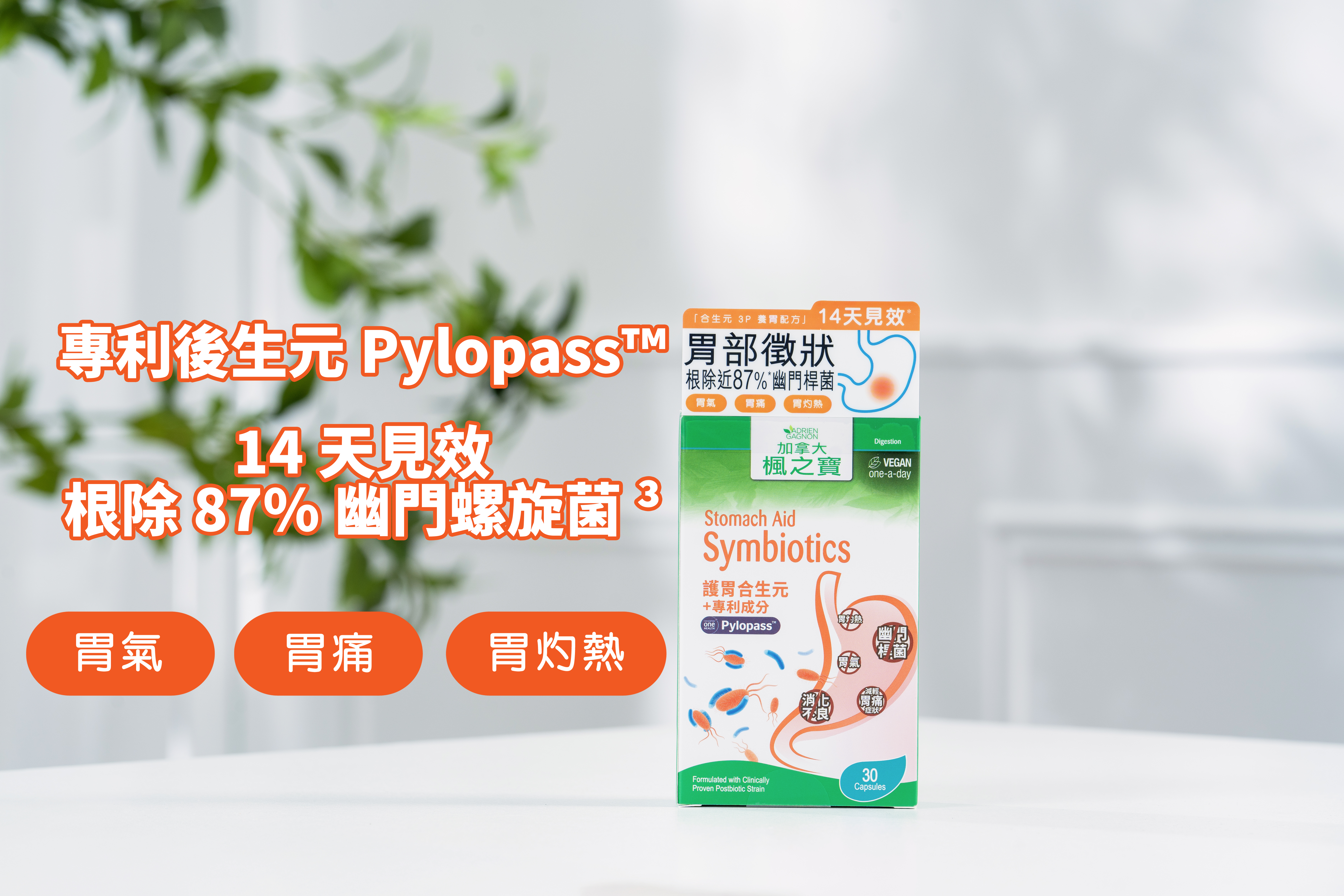 有超過5成香港人受幽門螺旋菌困擾²,主要透過唾液、體液及食物等傳播。而幽門螺旋菌進入身體後會留在胃部,破壞胃壁內黏膜層。如加拿大楓之寶護胃合生元內的專利成份Pylopass™,可針對及預防幽門螺桿菌,14天可根除率高達 87%幽門螺旋菌³,配合「合生元 3P 養胃配方」,可改善消化不良、胃痛、胃酸倒流、胃粘膜損傷,更是市面上第一款針對胃部幽門螺旋菌的合生元保健產品。