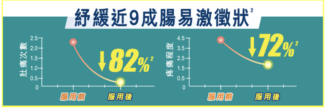 .9成腸易激徵狀⁵,紓緩肚痛、肚脹、及排便不清問題;