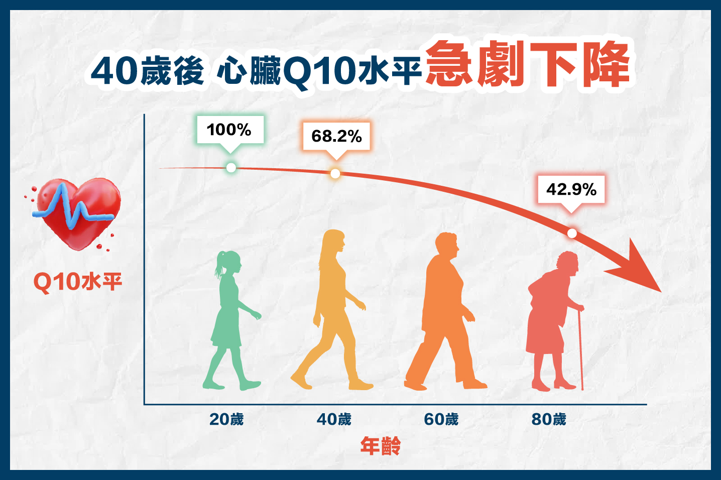 醫學界研究發現,功能變弱與體內「輔酶Q10」濃度不足密切相關。隨年齡增長,人體製造輔酶Q10的能力逐漸下降,40歲後心臟中的輔酶Q10含量可能僅剩年輕時的60%,導致心肌乏力、易疲勞,甚至增加心血管風險。