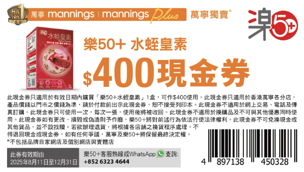 「樂50+ 水蛭皇素」現於萬寧獨家發售 。由即日起至2025年12月31日,憑指定$400現金券購買「樂50+水蛭皇素」1盒,即可作$400使用!
