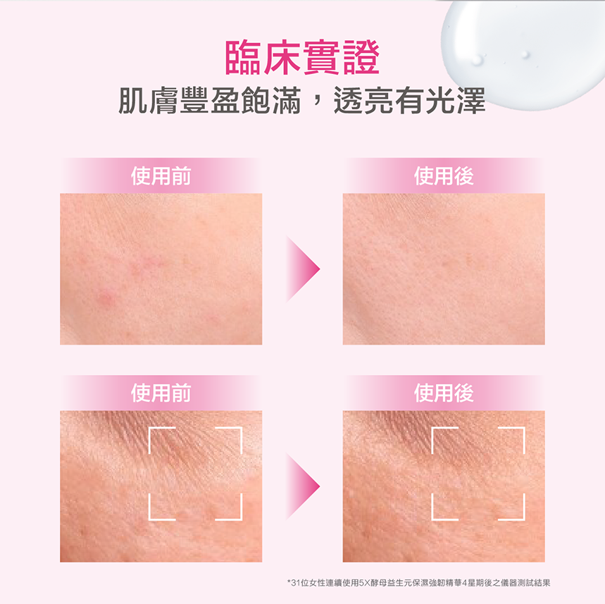 ⁴31位女性連續使用5X酵母益生元保濕強韌精華4星期後之專業感官刺激測試結果