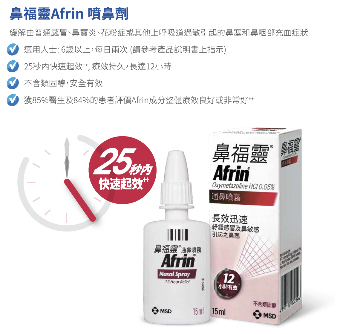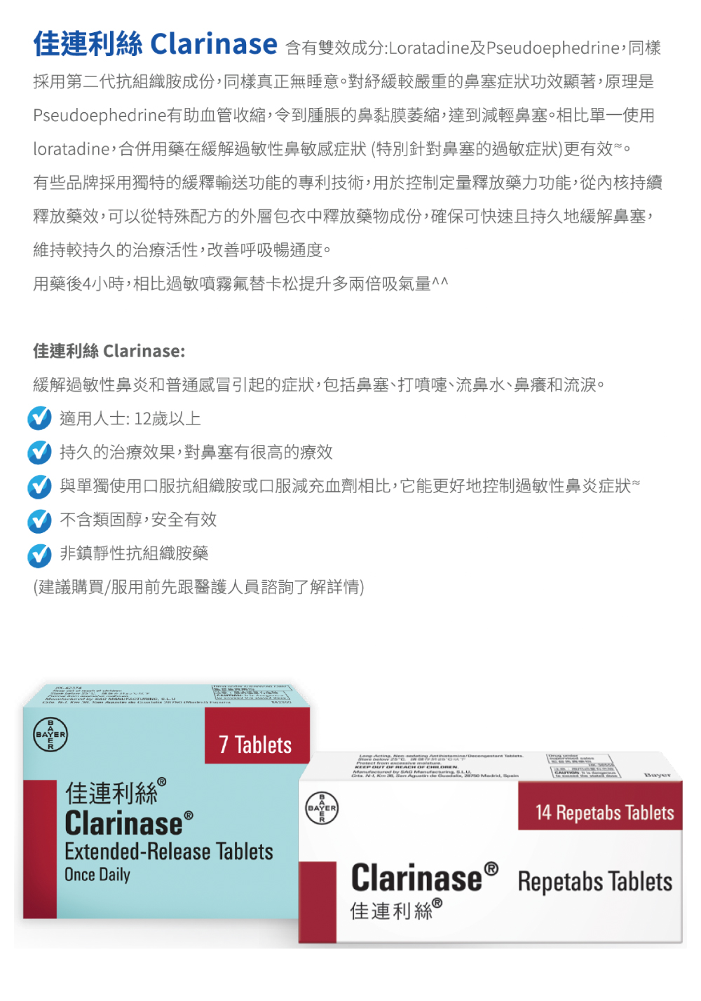 3.如果過敏時鼻塞特別嚴重,佳連利絲Clarinase口服藥片或鼻福靈Afrin 噴劑會是更對症下藥的首選。