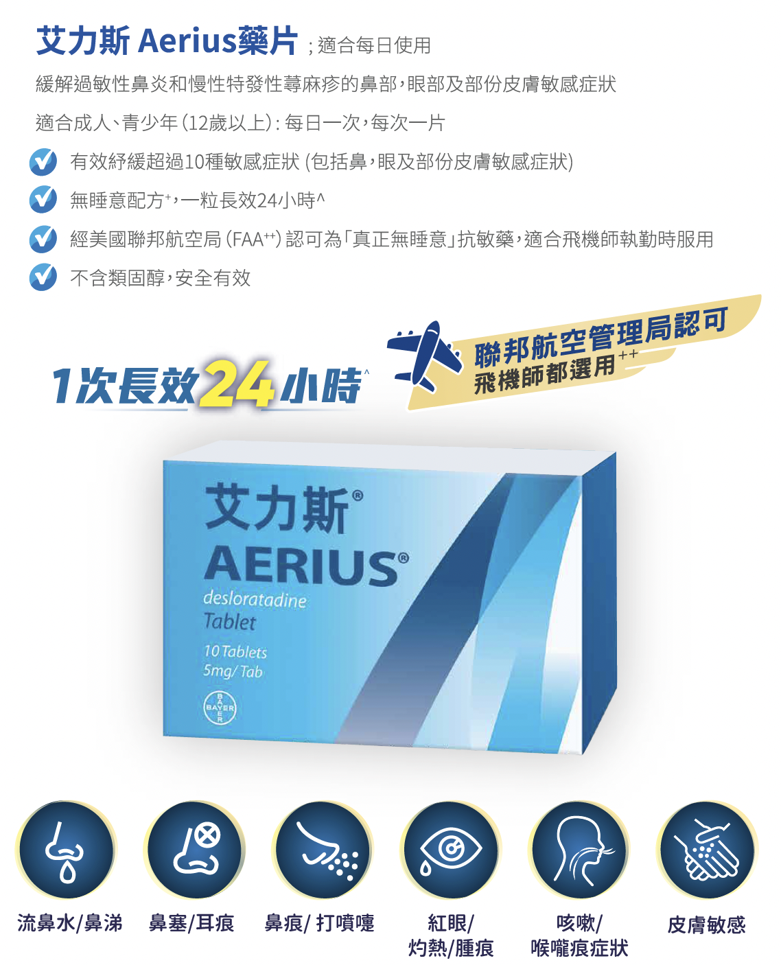 得到美國聯邦航空局(FAA++)認可為「無睡意」抗敏藥物,呢個係經過嚴格篩選,只有三款成份入選,包括Loratadine(佳力天 Clarityne)及Desloratadine(艾力斯 Aerius),代表即使對警覺性要求極高的飛機師都可服用,即係連飛機師都選用++,足見其安全性。
