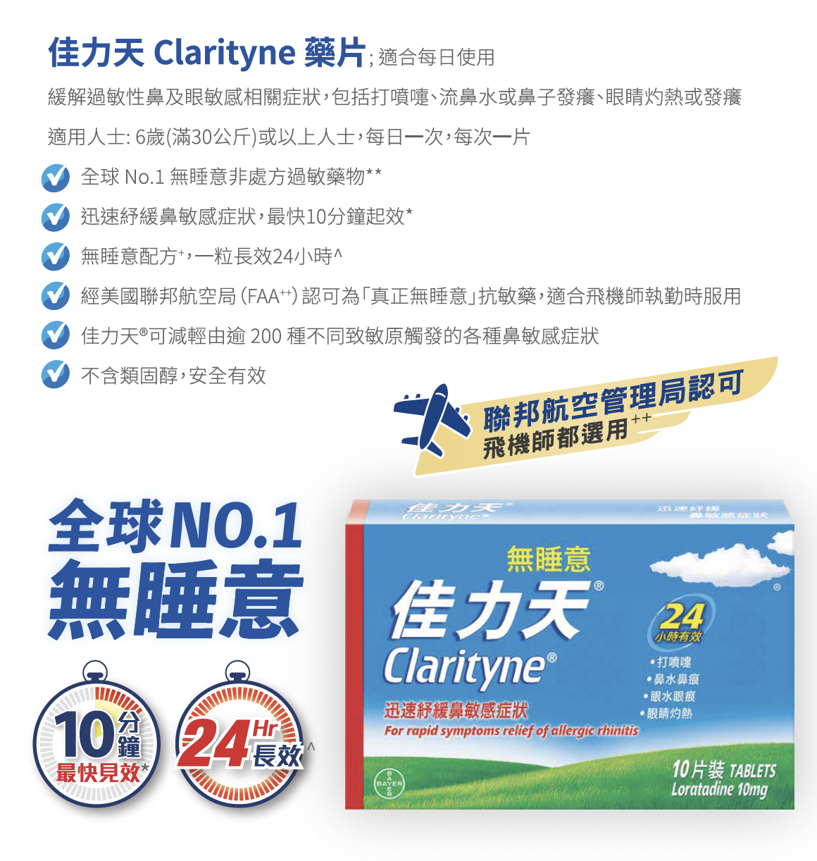 佳力天 Clarityne (成份:Loratadine)對於打噴嚏、流鼻水、鼻子眼睛癢等典型過敏症狀,片裝最快10分鐘起效*,藥效可持續24小時^,無睡意配方+,食咗唔會恰眼瞓。2歲以上兒童也可選擇糖漿,不含人造色素和無添加糖。