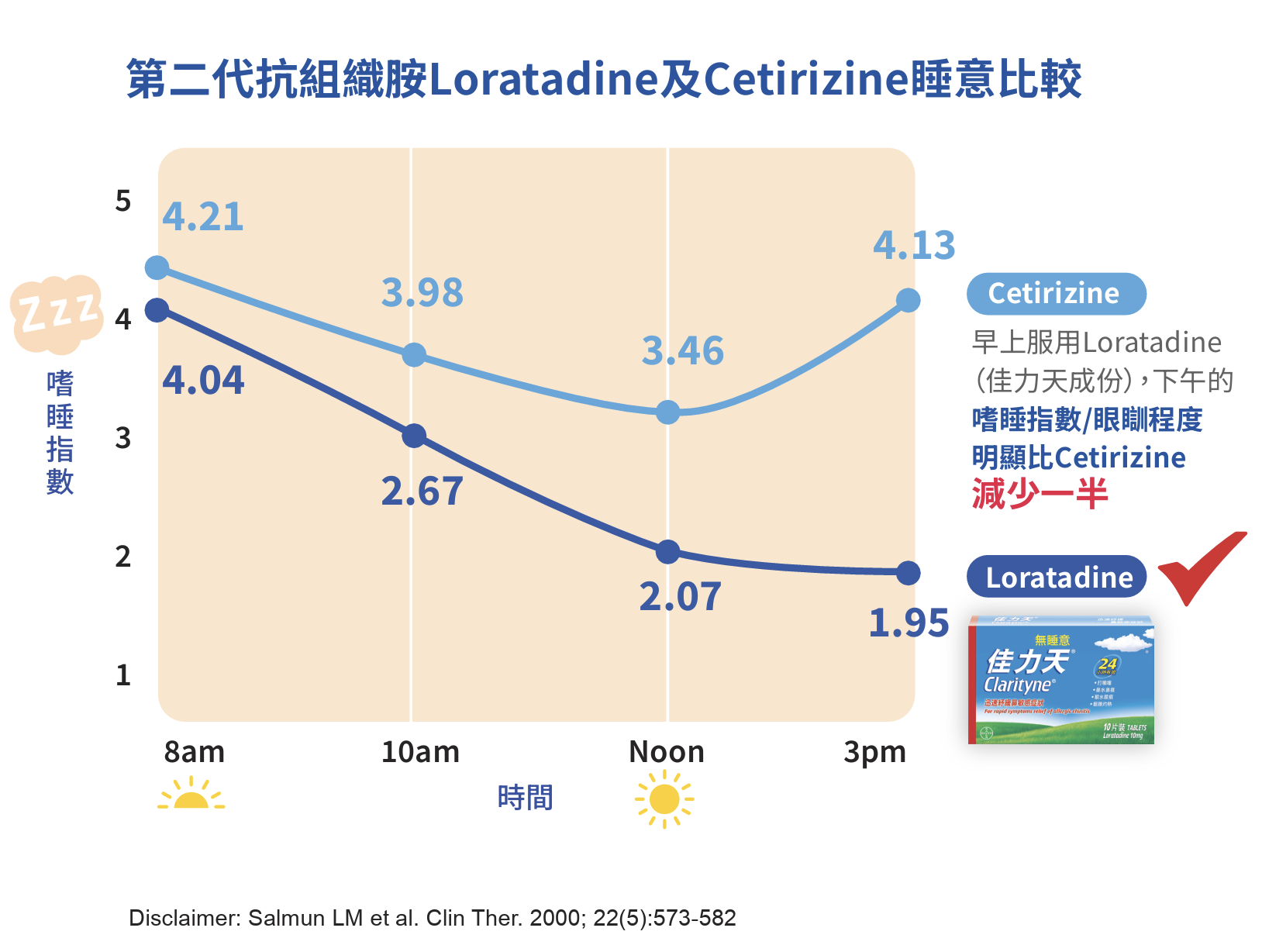 例如選擇具規模的大藥廠旗下的抗敏成份產品: 佳力天(成份為Loratadine),你就無需要晌「紓緩症狀」同「保持專注力(唔眼瞓)」兩難之間取捨。