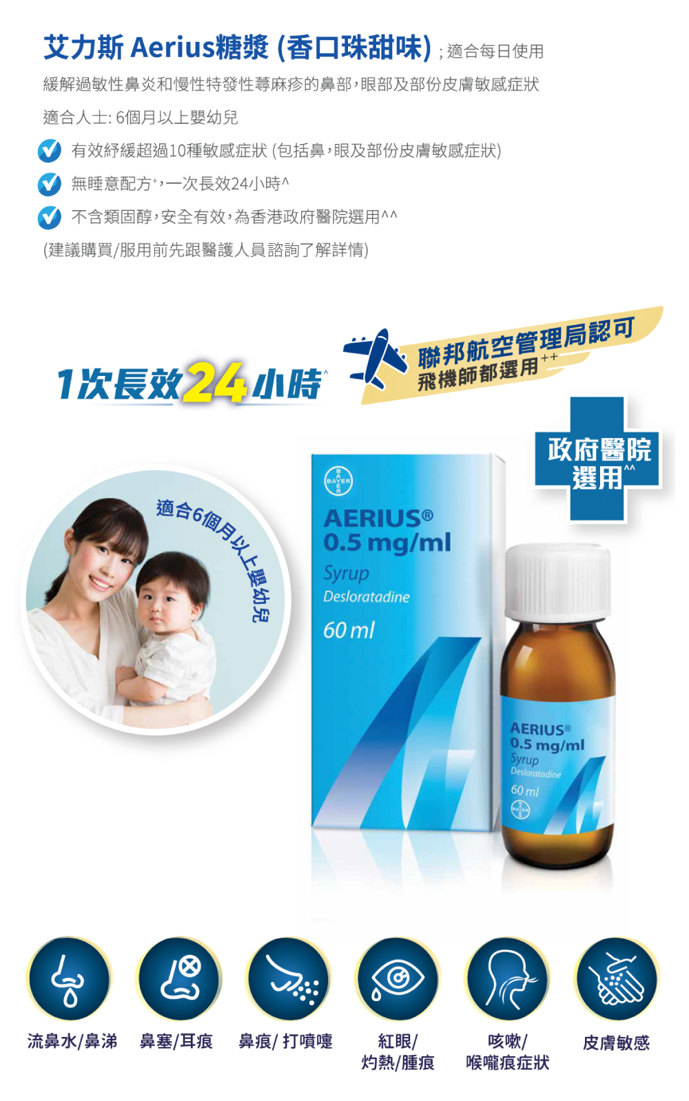 1.如果家中有6個月以上的嬰幼兒過敏#,家長們可以首選艾力斯 Aerius(Desloratadine)糖漿。
