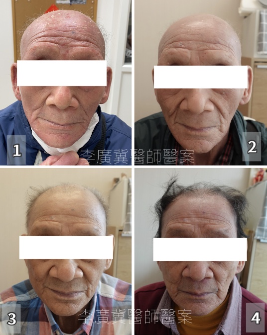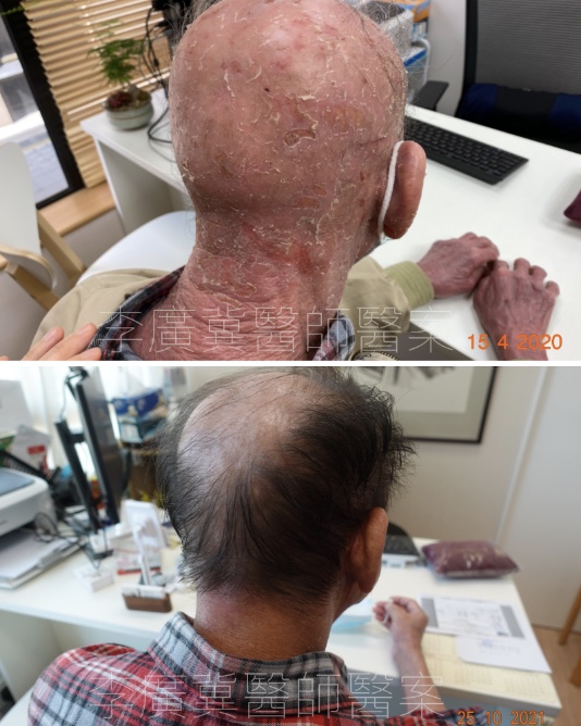經過約四個月的耐心治療,奇蹟開始展現。李伯伯全身的紅腫逐漸消退,原本因發炎發熱而變得又紅又黑的皮膚,竟然開始褪色並回復正常的白皙膚色,堪稱「青靚白淨」。更令人驚喜的是,原本因頭皮發炎而掉光的頭髮,也慢慢長出灰黑色的新髮,這對長者而言是極大的鼓舞。
