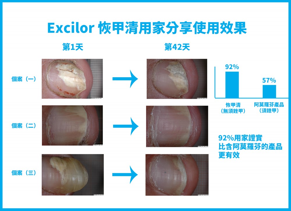 用家分享的成功個案,都在使用全港銷售No.1 的Excilor恢甲清,其獨有Transactive滲透技術,無須銼甲,33秒即可直達甲床,92%用家使用恢甲清後完全康復或改善,相比需要銼甲的阿莫羅芬灰甲產品高出1.6倍!最大優點是無須銼甲,使用方便,能推動灰甲患者堅持療程,從而根治灰甲,多人推薦使用是有原因的。現在還有推廣優惠,詳情請看:https://bit.ly/2ElLsc7