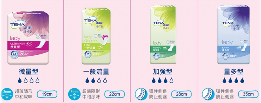 來自歐洲的添寧護妳墊能為妳有效解決尿滲問題,比衛生巾乾爽達8倍之餘,更達至瞬吸防漏、抗菌抑味功效。護妳墊系列有4款不同厚薄、長度和吸量的產品,照顧妳的不同需要,其中微量型及一般流量型更薄至3mm及4mm,助妳輕鬆擺脫尷尬,展現自信一面!