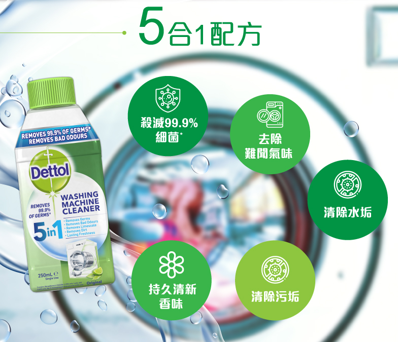 新推出的「滴露消毒殺菌洗衣機清潔劑」,蘊含5合1新配方:能殺滅99.9%細菌、去除洗衣機裡的難聞氣味、清除水垢、污垢,而且用後持久清新香味,為洗衣機進行大掃除!專家亦建議每兩個月最好清潔一次洗衣機,不但延長使用壽命,更可清除細菌隱患!