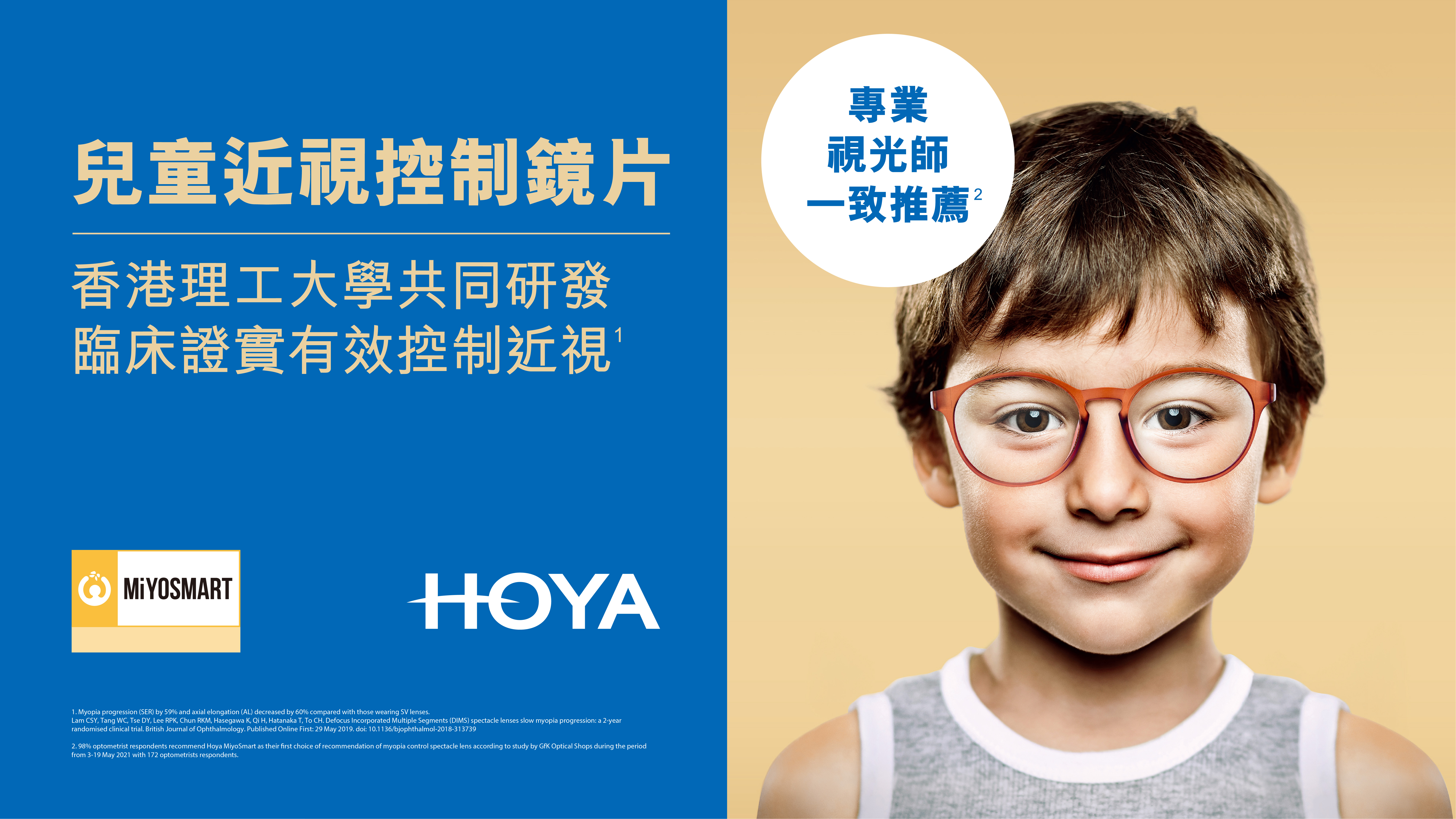 GFK市場調查公司早在今年5月,就兒童近視控制產品進行了網上問卷調查,結果指出高達98%的受訪視光師認為,由HOYA及香港理工大學眼科視光學院共同研發的MiYOSMART兒童近視控制鏡片最值得信賴,並會以它作為首選推薦的兒童近視控制鏡片2。難怪自2018年推出以來,MiYOSMART兒童近視控制鏡片全球已累積超過五十萬位小朋友採用,深受家長及小朋友信賴。