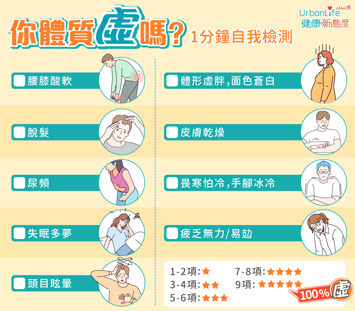 上述的症狀,是綜合各種體虛症狀而設,若出現的項目愈多,則愈有可能是體質虛了。其中三項最是常見: