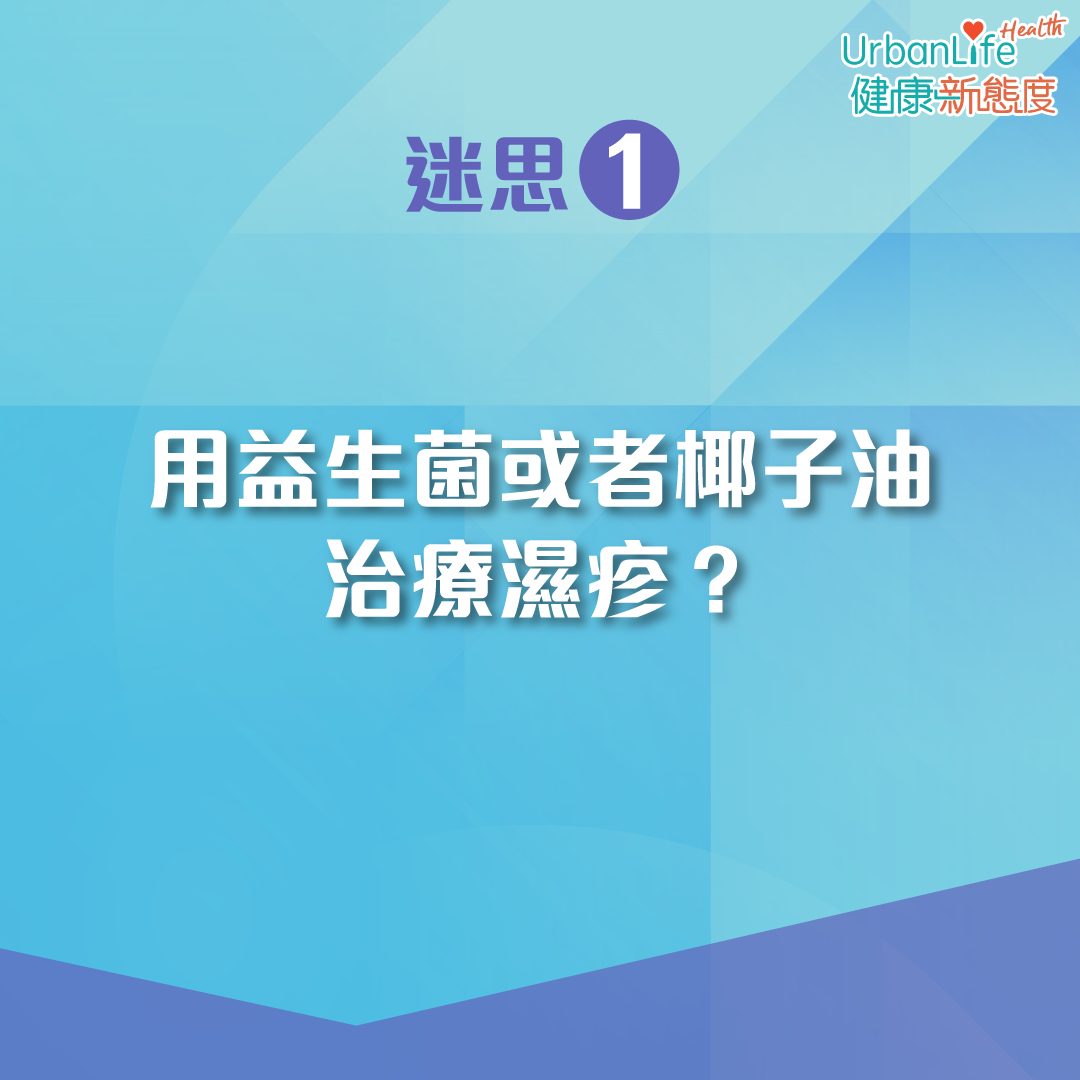坊間有不少說法指不同產品能治療濕疹,例如服用益生菌或者塗抹椰子油,亦有一些民間偏方,例如用片糖水洗澡,或是用薑塗抹患處因認為認為患者是「濕毒」。胡醫生則提醒其實這些方法並無任何科學根據,而且有一定危險性。椰子油,有時或會用作補濕,但椰子油含有植物蛋白,因此可能會引致皮膚敏感,導致小朋友使用後患處情況惡化,家長需要小心使用。也有其他家長會使用一些香薰治癒,其實這些都可能會令患處惡化,所以也要多加注意。至於益生菌就相對較為安全,但益生菌種類多,要考慮進食的劑量和開始進食的年紀,現時仍未有很完善的科研實證指出益生菌對濕疹的控制或避免濕疹有明顯幫助,所以西醫暫時亦不會採用益生菌作為濕疹治療。