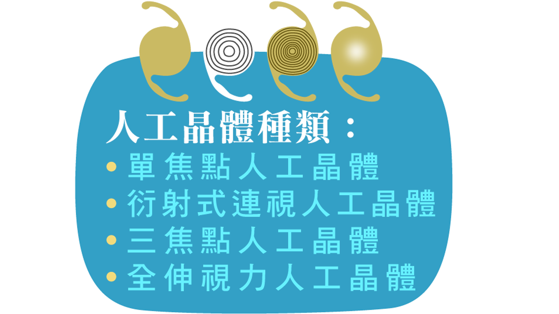 目前市面上人工晶體種類分為:單焦點人工晶體、衍射式連視人工晶體、三焦點人工晶體及最近推出的全伸視力人工晶體~