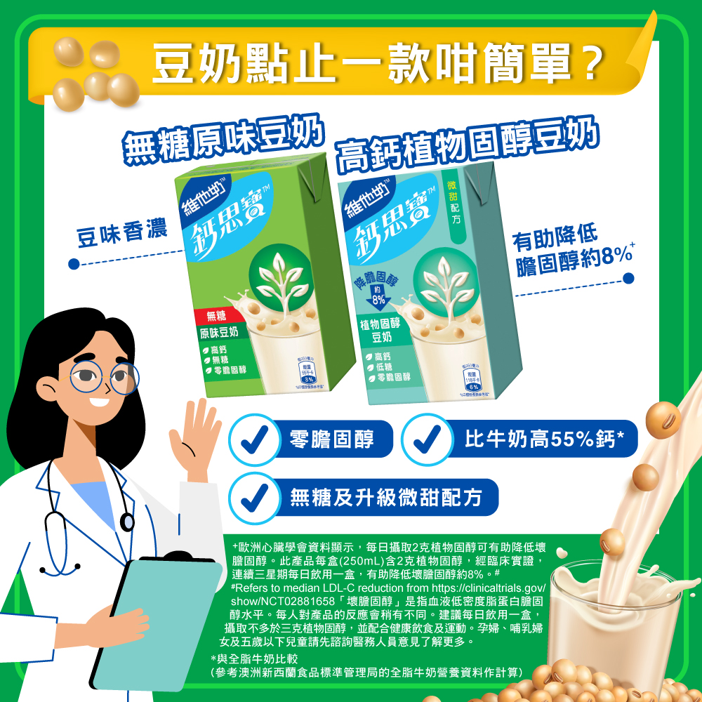 - 關注膽固醇的話,可選高鈣植物固醇豆奶(升級微甜配方),含植物固醇有助降低膽固醇2。