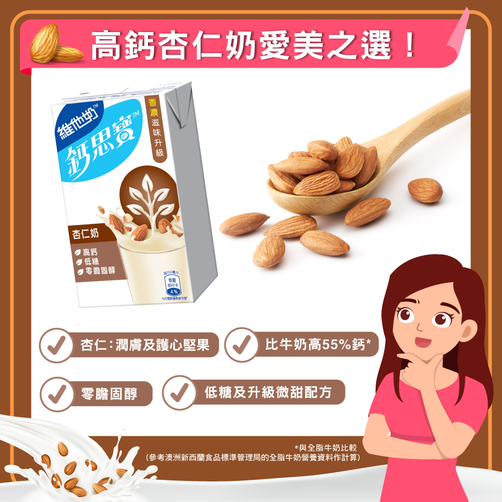 愛美一族,想攝取鈣質又要減少攝取卡路里,可試飲維他奶鈣思寶杏仁奶,其高鈣、低糖、零膽固醇配方,鈣量比牛奶高55%1,熱量比牛奶低49% 3 。升級配方,杏仁味更香濃,啖啖滋味又健康!