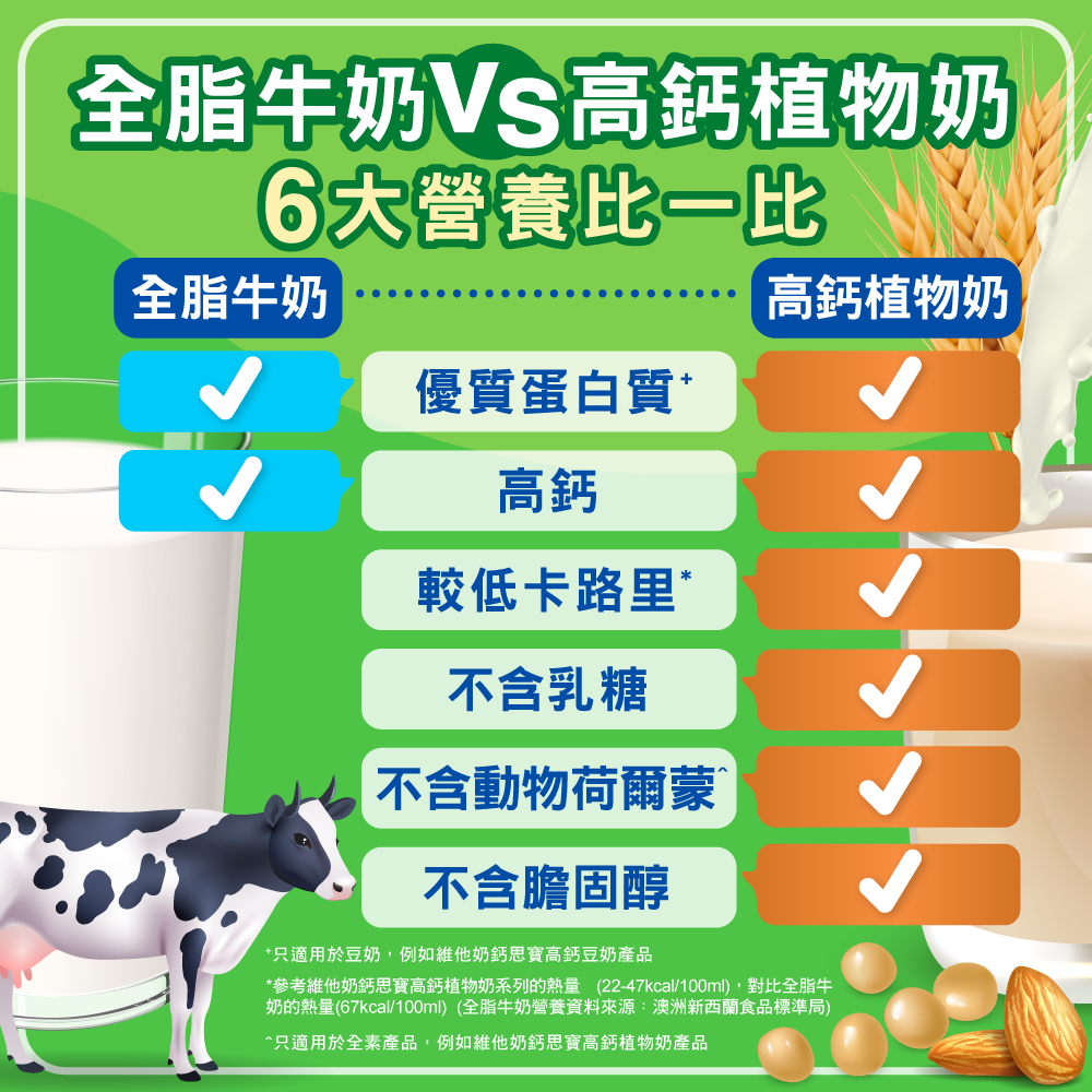 1與全脂牛奶比較。維他奶鈣思寶高鈣植物奶系列的鈣量為170mg/100ml。全脂牛奶的鈣量為109mg/100ml (資料來源: 澳洲新西蘭食品標準管理局)。