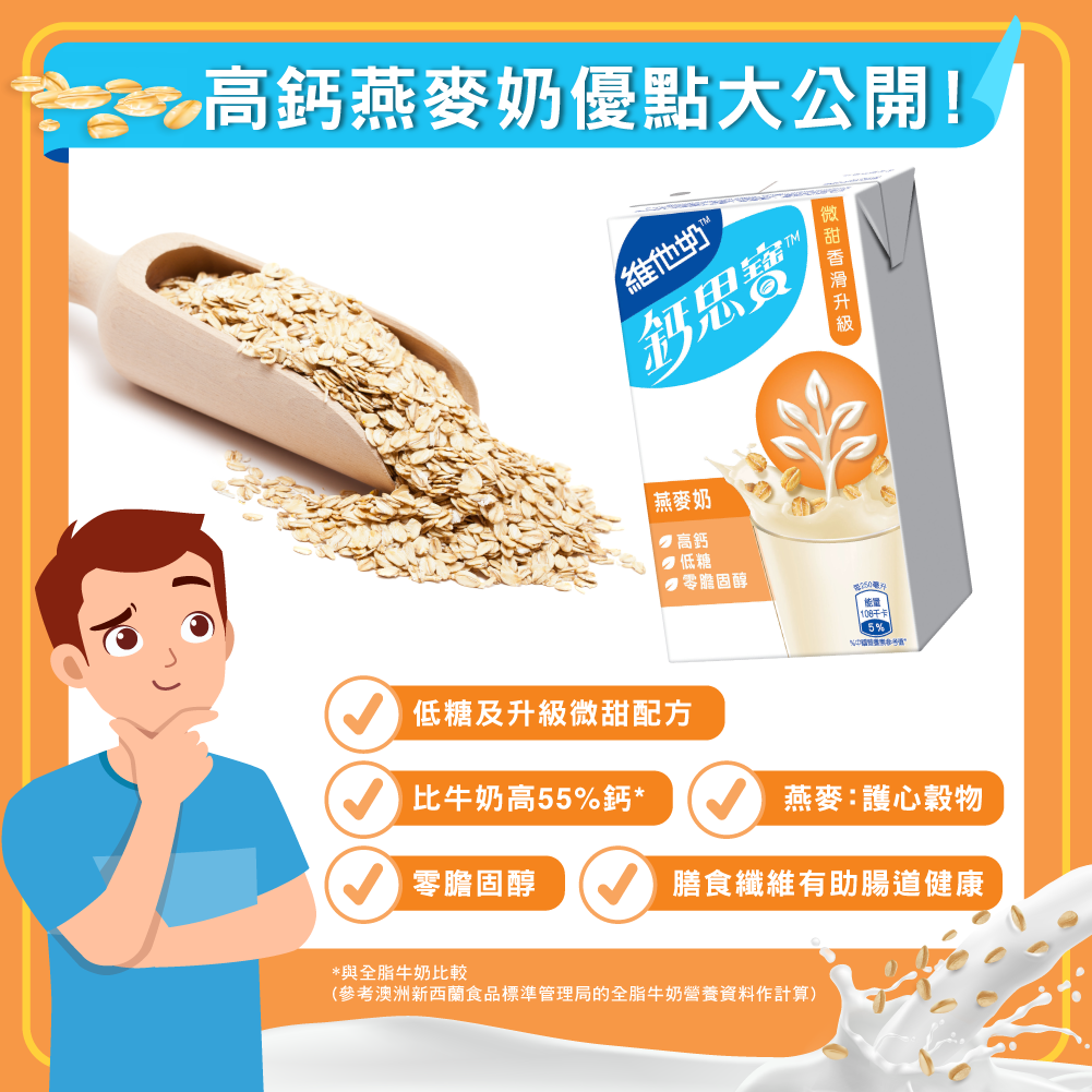 維他奶鈣思寶高鈣燕麥奶採用優質燕麥製造,不但是健康飲食的好幫手,含鈣量比牛奶高55%1、熱量低35%4,每250毫升提供相等於7杯沙律菜的纖維量5,有助腸道健康,升級微甜香滑配方,香滑美味,味道更佳。