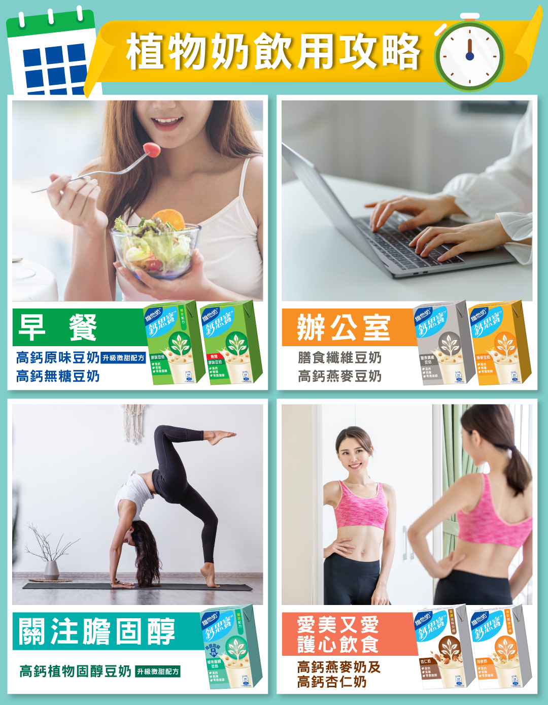 以為豆奶只得一款選擇?那就錯了!系列除了高鈣原味豆奶,還有無糖豆奶。日常飲食多肉少菜的話,可選擇纖維孖寶----高鈣燕麥豆奶及膳食纖維豆奶,補充纖維以支持腸道健康。關注膽固醇的朋友,不可錯過降膽固醇之星----高鈣植物固醇豆奶(升級微甜配方),連續飲用3星期,可以有助降低膽固醇約8%2!