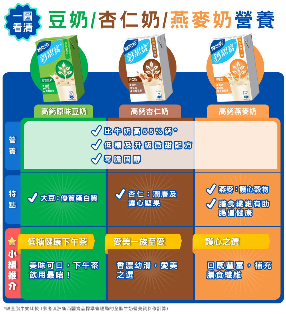 維他奶鈣思寶高鈣植物奶系列採用優質大豆、燕麥、杏仁製造,天然健康,鈣質含量比牛奶高55%1,高鈣、低糖、零膽固醇,而且款式選擇多,無糖或微甜配方,滿足不同人士對甜味的追求,是日常健康飲食好拍檔!