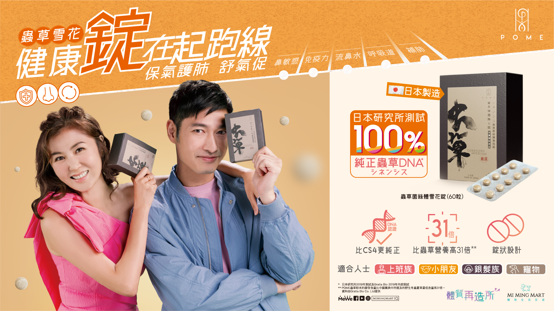 優質蟲草產品可於彌明生活百貨入手,近期推出的「POME 蟲草菌絲體雪花錠」,採用獨一無二POME專用的蝙蝠蛾擬青黴純菌種,是目前市面上罕見的榮獲日本測試機構確認,驗證為100%正統的蝙蝠蛾擬青黴,其DNA排序與野生冬蟲夏草完全相同。於日本廠房經過良工巧匠的發酵過程,其保健價值遠比野生冬蟲夏草更高。按此了解更多:https://www.mimingmart.com/product/pome-cordyceps-mycelium-tablets/